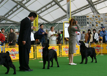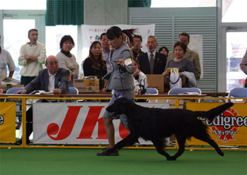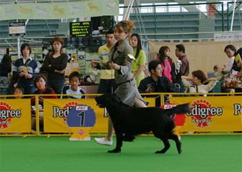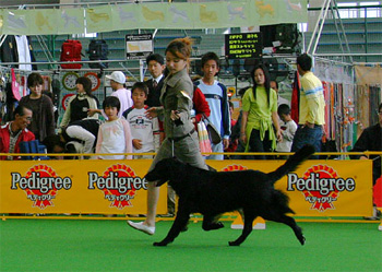 2004.10.24岡山県岡山ドームにてFCIインターナショナルドッグショー中国ブロックが開催されました。会場は全面に長めの人工芝が貼られていてクッション性が良く、通常のFCIにありがちなビニールシートに、走るところだけマットが敷かれた安っぽい会場と違い、とても走りやすかったです。ガラス張りで光が射しているためとても明るい雰囲気の良い会場でした。パドックも会場とは別で駐車場に設置できたので荷物を搬入する手間もないし、会場内がうるさくない、何よりも臭くない事が大変良かったです。そんな中、クラブからはオスアダルト:シェリル、オスチャンピオン:ヴィーヴォ、メスFCIチャンピオン:ディスティノが出陳しました。シェリルはアダルト1位、ヴィーヴォ、ディスティノがBOBを獲得しました。