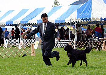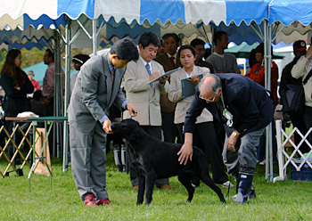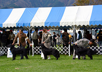 2004.10.31静岡県 朝霧高原ミルクランドにて、静岡東マウントフジドッグクラブ主催のドッグショーが開催されました。前日からの雨で会場は泥沼の状態でしたが、ショーリンクはきれいなラフで走りやすかったです。総数16頭の内、クラブからはオス3頭、メス3頭が参加しました。オスジュニア:ライナスがクラス1位、オスアダルト:シェリルがウィナーズドッグ、オスチャンピオン:ヴィーヴォがBOBを獲得しました。メスジュニア:アイリーがクラス1位、メスアダルト:ジェーンがクラス3位、ブリードジャッジはイギリスのキース・ヤング氏でしたが、触診、歩様をとても丁寧に観察していただきました。また、オスBOB:ヴィーヴォは参加総頭数650頭のショーでエクセレントグループに選出されました。