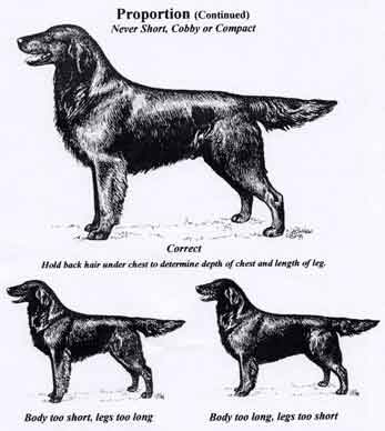 | STANDARD FLAT COATS FLAT-COATED RETRIEVER SOCIETY OF AMERICAより発行されている資料を掲載します。本当のスタンダードのフラットを理解するための参考にどうぞ!! ※最近、ドックショー、雑誌等でやたら頭部の大きなフラット、腹部が切れ上がったフラット、全体に幅のないフラット、骨格構成の悪さからまっすぐ足を運べないフラット、顔に品のないフラットを見かけます。同じフラットとは思えません。又、スタンダードに太ったタイプ,痩せたタイプ、2タイプあるように言っているブリーダーがいますがスタンダードは世界に1タイプしか有りません、同じく、イギリス系,アメリカ系も同じ事が言えます。ノースポイントケンネルのフラットコーテッドレトリバーはイギリス人ジャッジにも絶賛されています。本物のフラット=スタンダードのフラットを正しく理解するためにも一度御覧下さい 。 一般外貌 フラット・コーテッド レトリーバーは、知的な表情や均整のとれた外観をもち、陽気で活動的でもある多才なレトリーバーである。フラットは、“がさつさのない力強さと貧弱さのない活力”を示すこととして、伝統的に記述されていた。 性 質 フラットは、本来ファミリー コンパニオン ハンティング レトリーバーである。 サイズ 好ましい高さは、き甲部から雄犬で23インチから24.5インチ(約58センチメートル〜約62センチメートル)、雌犬は22インチから23.5インチ(約56センチメートル〜約60センチメートル)である。 体型 フラットは、ずんぐりした体格ではない。 肩の先端から太もも上部の後方の突起までの体長は、き甲部の体高に比べてわずかに長い。 頭部 長く均整の取れた形の良い頭部は、容易に大きなキジやカモ、野ウサギを運ぶのに十分な大きさと力強さがある。 ストップ 緩やかで、ストップがわずかにあり、下向きや皿のくぼみのような印象の顔つきは避けること。 眼 眼と眼の間は、広い。中くらいの大きさでアーモンド型。色はダークブラウン、あるいはヘーゼル。大きい眼や丸い眼、色が黄色は、認められない。 眼の端は、単色で引き締まっている。 耳 耳は、頭部の横に比較的小さく、程よい位置にぴったりとつき、豊かな飾り毛がある。 鼻 鼻孔は、大きい。 黒の犬はブラック、リバーの犬はブラウン。 顎 顎は長く、野ウサギやキジをくわえて運べる力強さがある。 噛合わせ シザーズ バイトが好ましい。 レベル バイトでも認められる。 トップライン 力強く平らなこと。 胸部 適度に広く、肘に達する深い胸がよい。 尾 ほぼまっすぐで、程よい位置にあり、おおよそかかとに届くぐらい。 被毛 被毛は適度に長く、濃密でツヤがある。 理想的な被毛は、まっすぐで平らある。 わずかなウエーブは許されるが、巻毛や縮れ毛、細すぎたりふわふわした被毛は、認められない。 色 単色のブラック、またはリバー。 ボディバランス a.理想的なバランス(下図上側)