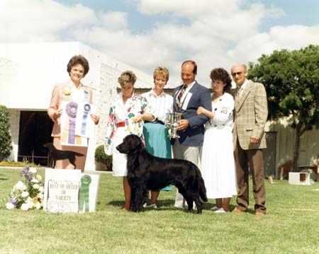 エディーは、アメリカに初めてフラットを輸入した犬舎であるアーサークラフト犬舎が作出したフラットです。1988に開催されたThe Flat-Coated Retriever Society of America 1988 National Specialty(世界的にフラットのクラブとして権威あるソサエティーオブアメリカが主催する、フラット単独ではアメリカ最大のドックショーです。)においてBest of Breed[BOB]に輝いています。アメリカケネルクラブ[AKC]発行のフラットコーテッドレトリーバースタンダードビデオにてスタンダードフラットとして紹介されています。