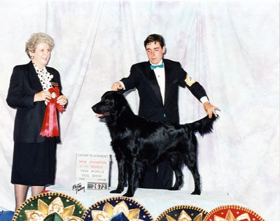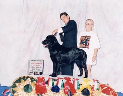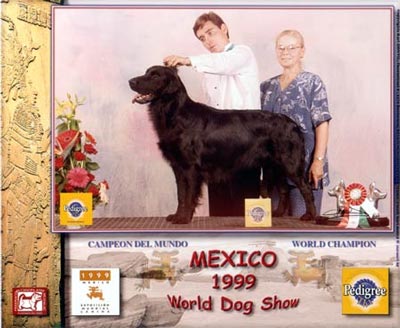 FCI加盟国及びアメリカ、イギリスの各国が参加する世界最大のドックショー、「World Dog Show」においてブリード戦4日間を通じて、Winners Dog、Best Male Dog、及びBest of Breedを獲得し、各ジャッジよりエクセレントの評価を得ました。また8グループのグループ戦においても4日間に2席、3席を獲得しました。特にグループ2席を獲得した時は、8グループ241頭もの犬を押さえて2席となったのです。マグナムはノンタイトルながら並居る各国のチャンピオン犬をものともせず、見事にフラットの頂点を極めたわけです。そして僅か4日間のショーでMexico CH、Las America CH、World CHのタイトルを獲得。このショーに於いてNorth Pointのフラットのクオリティーの高さを全世界に証明したことになります。また、このショーの模様は、アメリカ、メキシコのテレビで紹介されました。その際、マグナムもテレビ出演をし、大人気となっています。